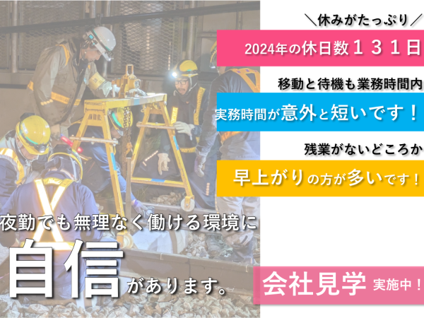 | 特徴 | <軌道工の魅力をご紹介> (1)社会貢献度が高い! 鉄道の安全運行を支え、多くの人々に役立つ誇りある仕事で陰の立役者。 (2)専門技術が身につく! インフラでもある鉄道保守の技術は、一生使えるスキルです! (3)チームワークを活かして働けるから安心! 仲間と連携し、協力し合いながら働く充実感があります。 (4)安定収入も魅力! 軌道工はインフラ保守でもあるため、お仕事は景気に左右されず安定しています!だからこそ収入も安定します。 \未経験でも安心して働ける環境に自信があります!/ 入社後は道具の名前からしっかり教えます! 業界・職種の経験がない方でも安心! チームワークが必要なお仕事でもありますので一緒に働く雰囲気作りを大切にしています(*´ω`*) |